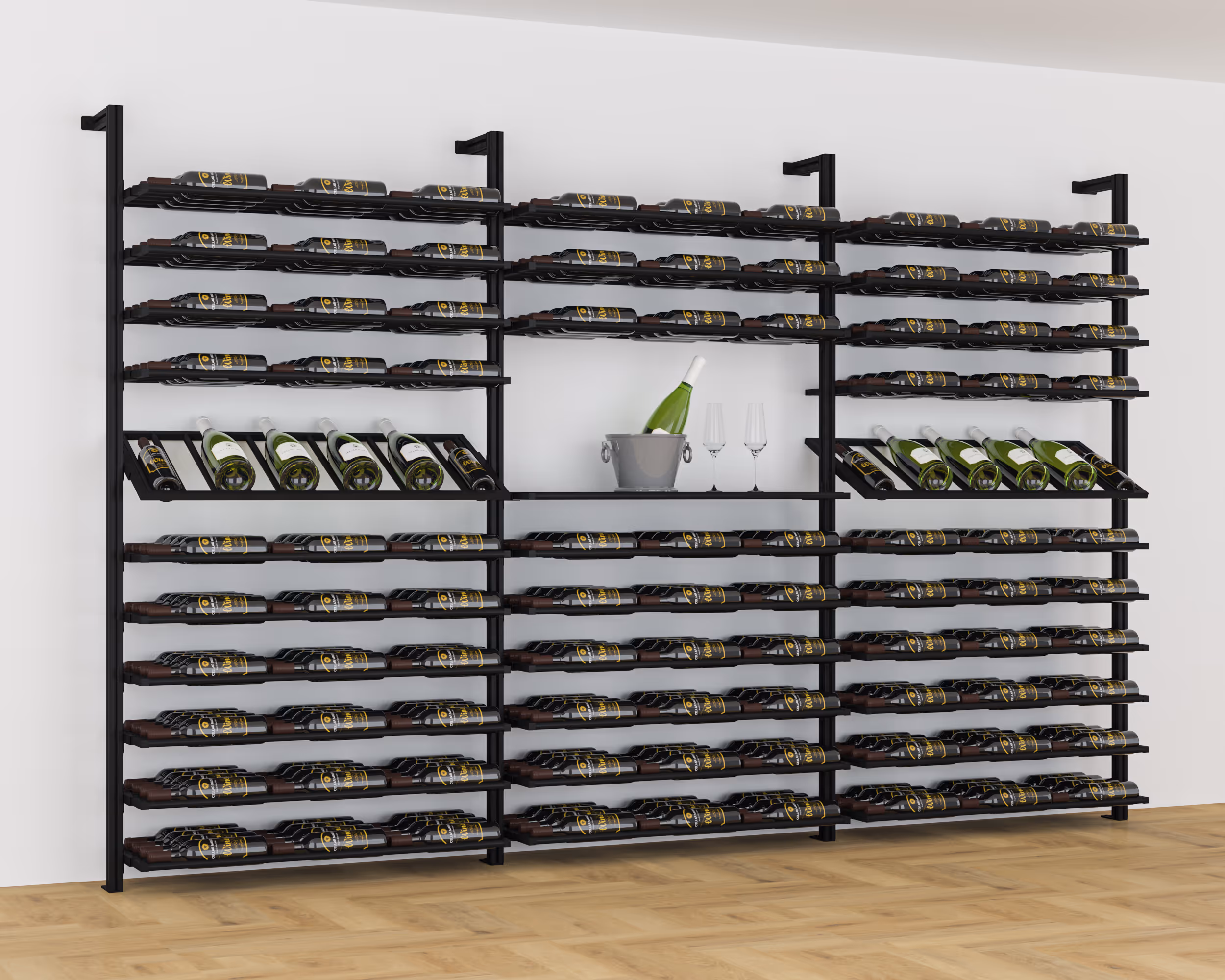 * Slim and durable matte black shelving suits both contemporary and traditional living spaces * Serious collectors wanting to maximise storage vs price should consider our high capacity horizontal shelving or, * Showcase your fine wine with our angled bottle display shelving * Fully configrable with height adjustable shelving * Ceiling or wall mount fixing options * Simple to install